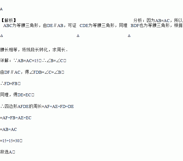 如图,△ABC中,AB=AC=15,D在BC边上,DE∥BA于点E,DF∥CA交AB于点F,那么四边形AFDE的周长是( )