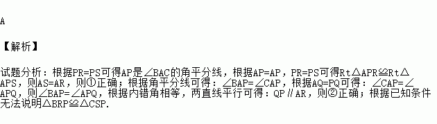 A 【解析】 试题分析:根据PR=PS可得AP是∠BAC的角平分线,根据AP=AP,PR=PS可得Rt△APR≌Rt△APS,则AS=AR,则①正确;根据角平分线可得:∠BAP=∠CAP,根据AQ=PQ可得:∠CAP=∠APQ,则∠BAP=∠APQ,根据内错角相等,两直线平行可得:QP∥AR,则②正确;根据已知条件无法说明△BRP≌△CSP.
