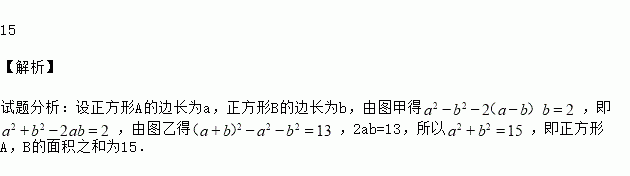 有两个正方形A,B,现将B放在A的内部得图甲,将A,B并列放置后构造新的正方形得图乙.若图甲和图乙中阴影部分的面积分别为2和13,则正方形A,B的面积之和为 .
