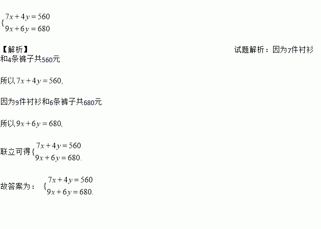 营业员昨天卖出7件衬衫和4条裤子,共560元,今天又卖出9件衬衫和6条裤子,共680元.若设每件衬衫的售价为x元,每条裤子的售价为y元,则可列方程组为___________.