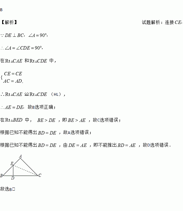 B 【解析】试题解析:连接 在和中, ∴≌(HL), 故B选项正确; 在中, ,即,故C选项错误; 根据已知不能得出,故A选项错误; 根据已知不能得出,由,即不能推出,故D选项错误. 故选B.