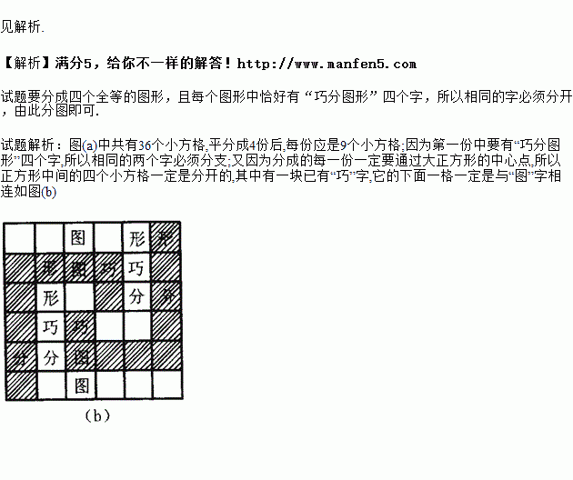 将下图分成四个全等的图形,而且每一份图形中恰好有“巧分图形”四个字.