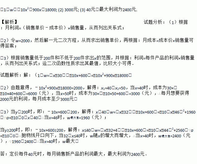 (1)w=-10x2+900x-18000; (2) 3000元; (3) 40元,最大利润为2400元. 【解析】试题分析:(1)根据:月利润=(销售单价﹣成本价)×销售量,从而列出关系式; (2)令w=2000,然后解一元二次方程,从而求出销售单价,再根据:月成本=成本价×销售量可得答案; (3)根据销售量低于200件和不低于200件求出x的范围,并根据:利润=每件产品的利润...