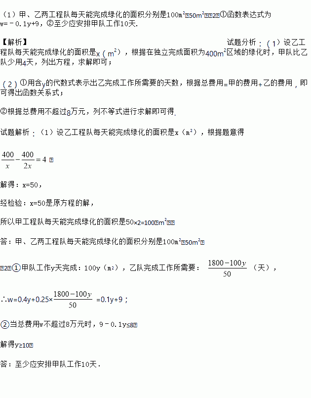 (2)若绿化区域面积为1800m2,学校每天需付给甲队的绿化费用为0.4万元,每天需付给乙队的绿化费用为0.25万元,设安排甲队工作y天,绿化总费用为W万元.