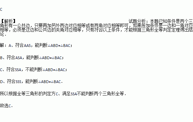 如图所示,在下列条件中,不能作为判断△ABD≌△BAC的条件是( )