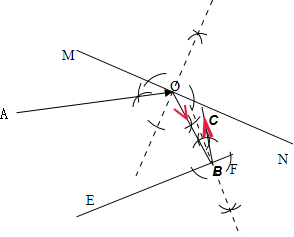 29、光线AO射到平面镜MN上后又反射到平面镜EF上,请画出经平面镜EF反射后的光线BC.(不写作法,但要保留作图痕迹)