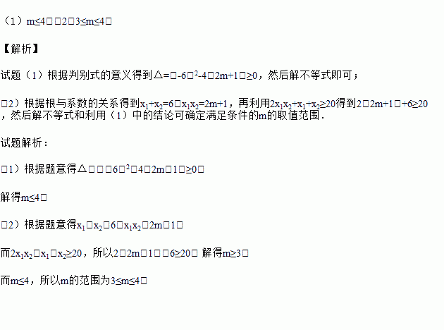 (2)如果方程的两个实数根为x1,x2,且2x1x2+x1+x2≥20,求m的取值范围.