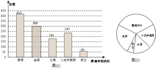 解答:解:(1)420÷35%=1200亩,1200-420-180-240-60=300亩;