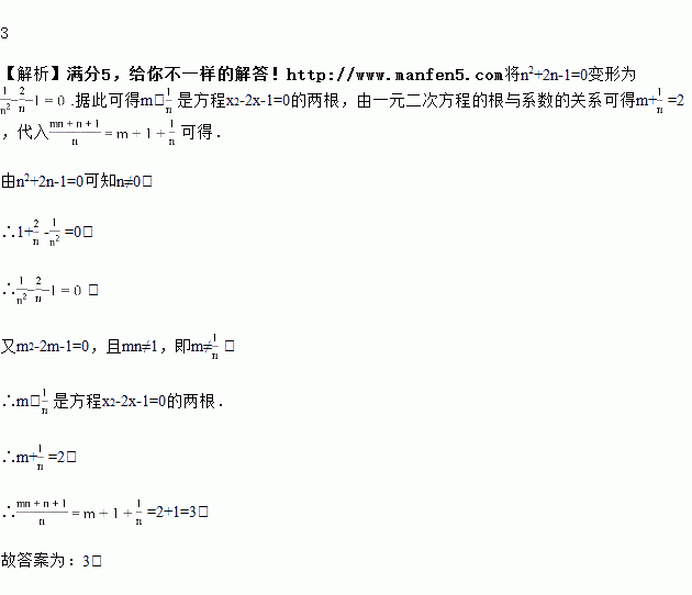 已知:m2﹣2m﹣1=0,n2+2n﹣1=0且mn≠1,则的值为_____.