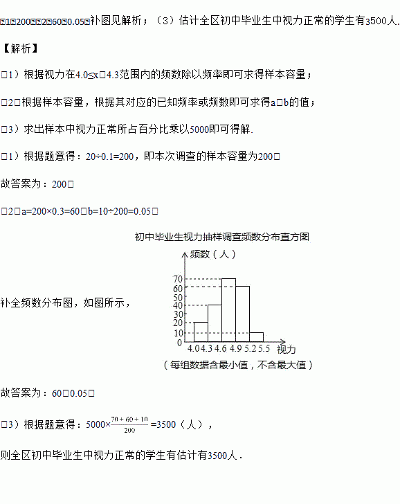 (3)若视力在4.6以上(含4.6)均属正常,根据上述信息估计全区初中毕业生中视力正常的学生有多少人?