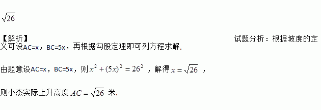 如图,当小杰沿坡度i=1:5的坡面由B到A行走了26米时,小杰实际上升高度AC=_________米.(可以用根号表示)