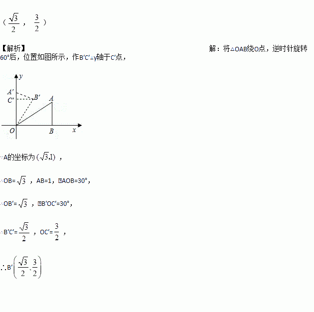 在平面直角坐标系中,Rt△OAB的顶点A的坐标为( ,1),若将△OAB绕O点,逆时针旋转60°后,B点到达B′点,则点B′的坐标是_______.