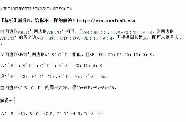 已知四边形ABCD∽四边形A′B′C′D′,且AB∶BC∶CD∶DA=20∶15∶9∶8,四边形A′B′C′D′的周长为26,求四边形A′B′C′D′各边的长.