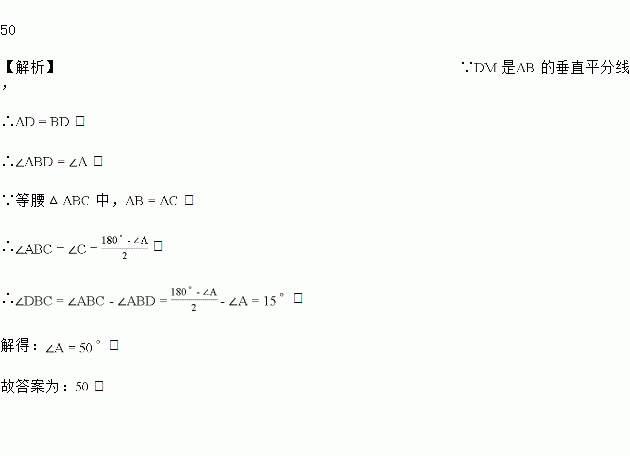 如图,等腰中,,的垂直平分线交于点,,则的度数是________度.