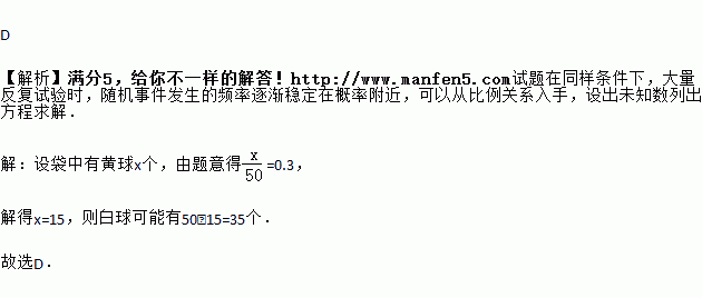 在一个不透明的布袋中装有50个黄、白两种颜色的球,除颜色外其他都相同,小红通过多次摸球试验后发现,摸到黄球的频率稳定在0.3左右,则布袋中白球可能有( )