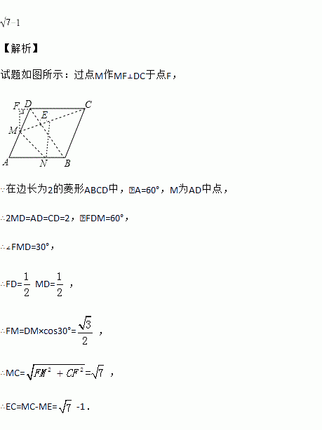 如图,在边长为2的菱形ABCD中,∠A=60°,点M是AD边的中点,连接MC,将菱形ABCD翻折,使点A落在线段CM上的点E处,折痕交AB于点N,则线段EC的长为_____.