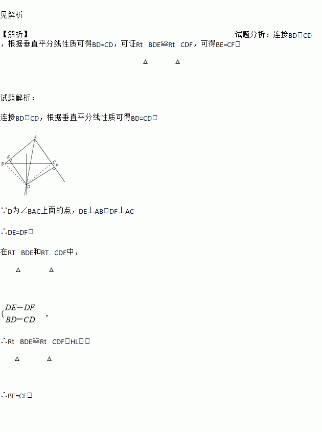 已知:如图∠BAC的角平分线与BC的垂直平分线交与点D,DE⊥AB ,DF⊥AC ,垂足分别为E,F.求证:BE=CF.