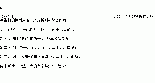 已知二次函数y=2(x﹣3)2+1.下列说法:①其图象的开口向下;②其图象的对称轴为直线x=﹣3;③其图象顶点坐标为(3,﹣1);④当x<3时,y随x的增大而减小.则其中说法正确的有【 】