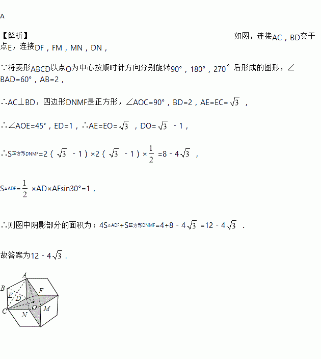 如图,是将菱形ABCD以点O为中心按顺时针方向分别旋转90°,180°,270°后形成的图形。若,AB=2,则图中阴影部分的面积为( )