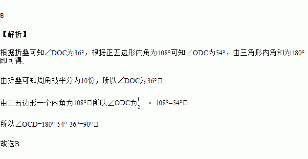 用折纸的方法,可以直接剪出一个正五边形(如图).方法是:拿一张长方形纸对折,折痕为AB,以AB的中点O为顶点将平角五等分,并沿五等分的线折叠,再沿CD剪开,使展开后的图形为正五边形,则∠OCD等于( )