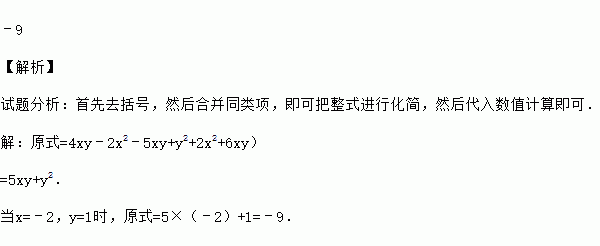 ﹣9 【解析】 试题分析:首先去括号,然后合并同类项,即可把整式进行化简,然后代入数值计算即可. 【解析】 原式=4xy﹣2x2﹣5xy+y2+2x2+6xy) =5xy+y2. 当x=﹣2,y=1时,原式=5×(﹣2)+1=﹣9.