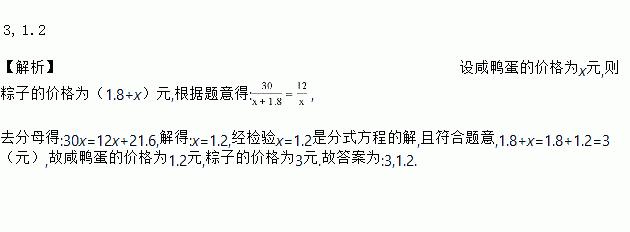 的价格相同).已知棕子的价格比咸鸭蛋的价格贵1. 8元,花30元购买粽子的个数与花12元购买咸鸭