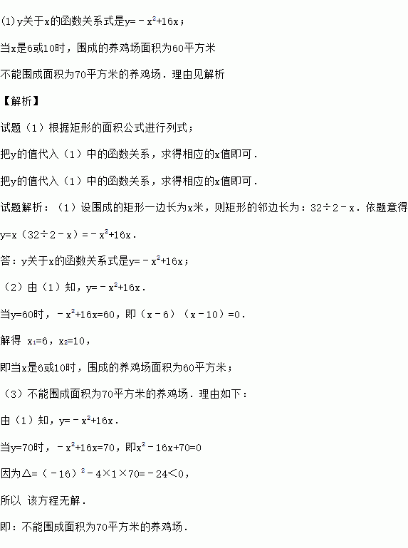 (3)能否围成面积为70平方米的养鸡场?如果能,请求出其边长;如果不能,请说明理由.