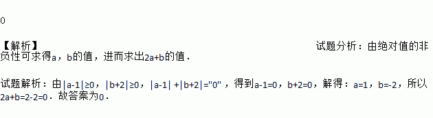0 【解析】试题分析:由绝对值的非负性可求得a,b的值,进而求出2a+b的值. 试题解析:由|a-1|≥0,|b+2|≥0,|a-1| +|b+2|="0" ,得到a-1=0,b+2=0,解得:a=1,b=-2,所以2a+b=2-2=0.故答案为0.如图,一个正五棱柱的底面边长为2cm,高为4cm。