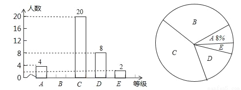 某校团委为积极参与“陶行知杯.全国书法大赛”现场决赛,向学校学生征集书画作品,今年3月份举行了“书画比赛”初赛,初赛成绩评定为A,B,C,D,E五个等级.该校七年级书法班全体学生参加了学校的比赛,并将比赛结果绘制成如下两幅不完整的统计图.请根据图中信息,解答下列问题.