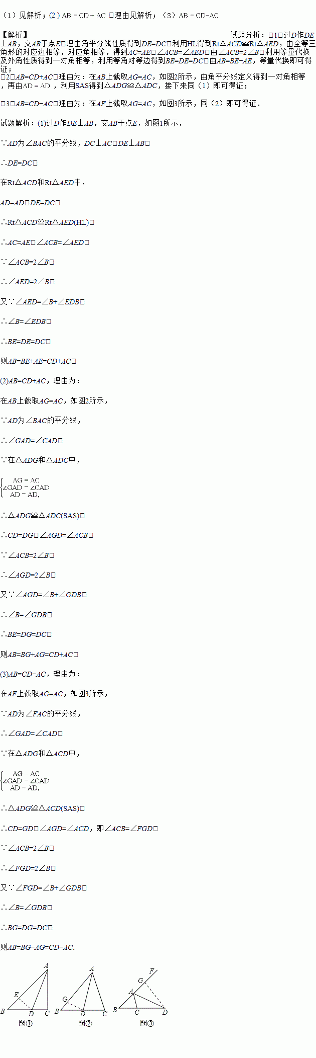 (3)如图③,当AD为△ABC的外角平分线时,线段AB、AC、CD又有怎样的数量关系?不需要证明,请直接写出你的猜想.
