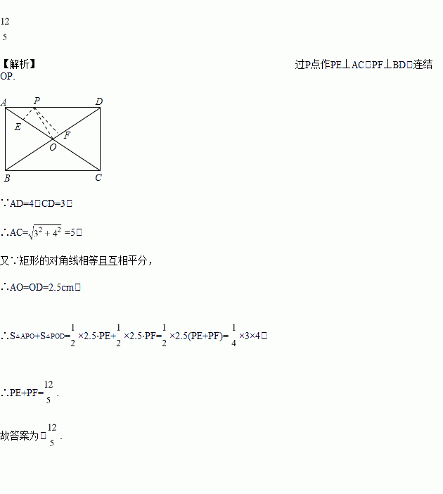 点 P是矩形ABCD的边AD上的一个动点,AB=3,AD=4,那么点P到矩形的两条对角线AC和BD的距离之和是_____