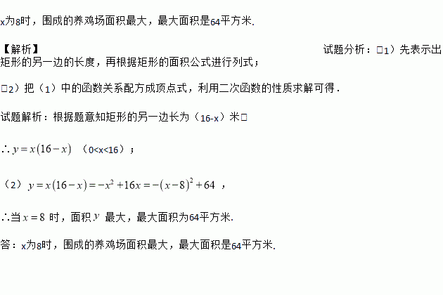 x为8时,围成的养鸡场面积最大,最大面积是64平方米. 【解析】试题分析:(1)先表示出矩形的另一边的长度,再根据矩形的面积公式进行列式; (2)把(1)中的函数关系配方成顶点式,利用二次函数的性质求解可得. 试题解析:根据题意知矩形的另一边长为(16-x)米, ∴ (0