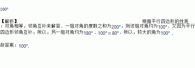 平行四边形的一组对角度数之和为200°,则平行四边形中较大的角为_________________.