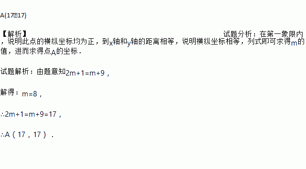 已知点A(2m+1,m+9)在第一象限,且点A到x轴和y轴的距离相等,求点A的坐标.