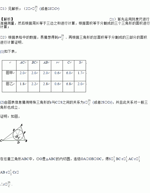 (2)观察图形,利用上表实验数据分析、猜测特殊三角形的r与C,S之间的关系,判断这种关系对任意三角形(图丙)是否也成立,并证明.
