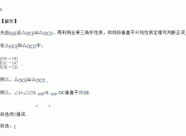 A. ∠1=∠2 B. S△OCE=S△OCD C. OD=CD D. OC垂直平分DE