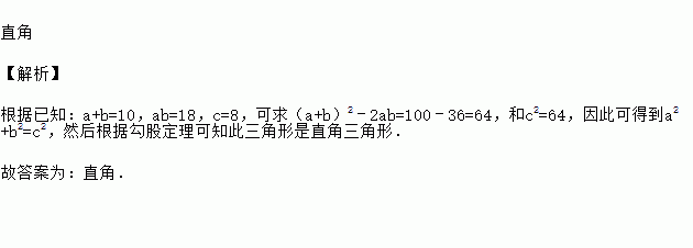 已知三角形ABC的三边长为a,b,c满足a+b=10,ab=18,c=8,则此三角形为______三角形.