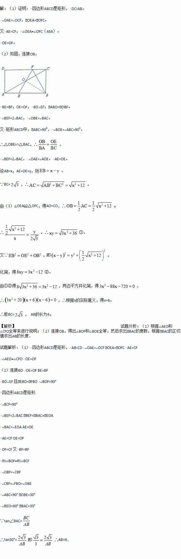 如图,在矩形ABCD中,E、F分别是边AB、CD上的点,AE=CF,连接EF,BF,EF与对角线AC交于O点,且BE=BF,∠BEF=2∠BAC。