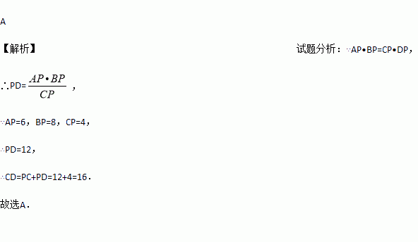 如图,⊙O的弦AB、CD相交于点P,若AP=6,BP=8,CP=4,则CD长为 ( )