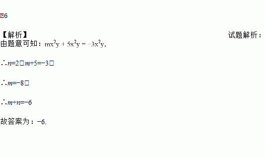 若单项式mx2y与单项式5xny的和是﹣3x2y,则m+n=_____.