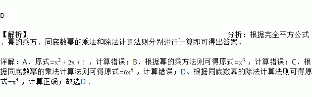 A. (x+1)2=x2+1 B. (x2)3=x5 C. 2x4•3x2=6x8 D. x2÷x﹣1=x3(x≠0)