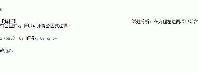 A. x1=0,x2=﹣5 B. x=5 C. x1=0,x2=5 D. x=0
