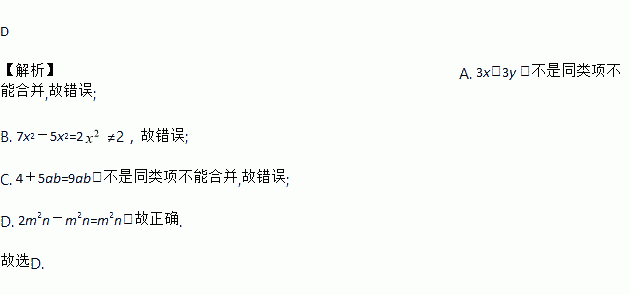 D 【解析】A. 3x+3y ,不是同类项不能合并,故错误; B. 7x2-5x2=2≠2,故错误; C. 4+5ab=9ab,不是同类项不能合并,故错误; D. 2m2n-m2n=m2n,故正确. 故选D.