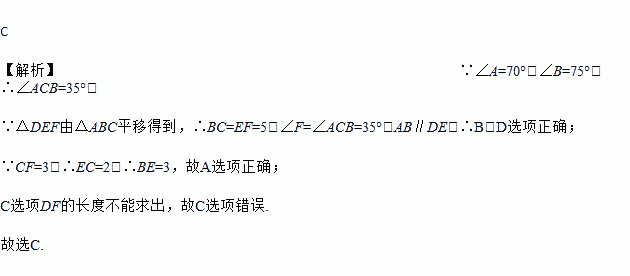 如图,在△ABC中,BC=5,∠A=70°,∠B=75°,把△ABC沿直线BC的方向平移到△DEF的位置,若CF=3,则下列结论中错误的是( )