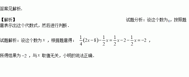 任意想一个数,把这个数乘后减,然后除以,再减去原来所想的那个数的,小明说所得结果一定是,请你通过列式计算说明小明的说法正确.