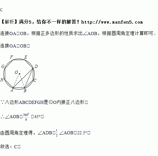 如图,正八边形ABCDEFGH内接于⊙O,则∠ADB的度数为( )