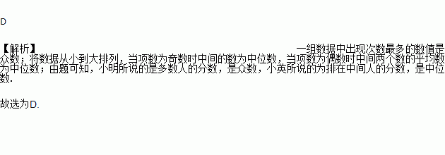 期中考试后,班里有两位同学议论他们所在小组同学的数学成绩,小明说:“我们组成绩是86分的同学最多”,小英说:“我们组的7位同学成绩排在最中间的恰好也是86分”.上面两位同学的话能反映出的统计量分别是( )