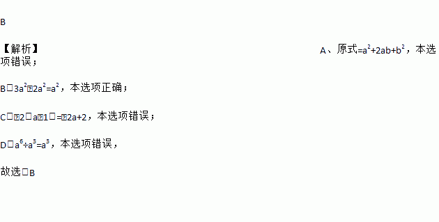 B 【解析】A、原式=a2+2ab+b2,本选项错误; B、3a2﹣2a2=a2,本选项正确; C、﹣2(a﹣1)=﹣2a+2,本选项错误; D、a6÷a3=a3,本选项错误, 故选:B