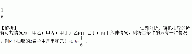 【解析】试题分析:随机抽取的所有可能情况为:甲乙;甲丙;甲丁;乙丙;乙丁;丙丁六种情况,则符合条件的只有一种情况,则P(抽取的2名学生是甲和乙)=1÷6=.