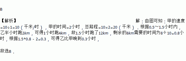 在一次越野赛中,甲选手匀速跑完全程,乙选手1.5小时后速度为每小时10千米,两选手的行程y(千米)随时间x(小时)变化的图像(全程)如图所示,则乙比甲晚到( )小时.